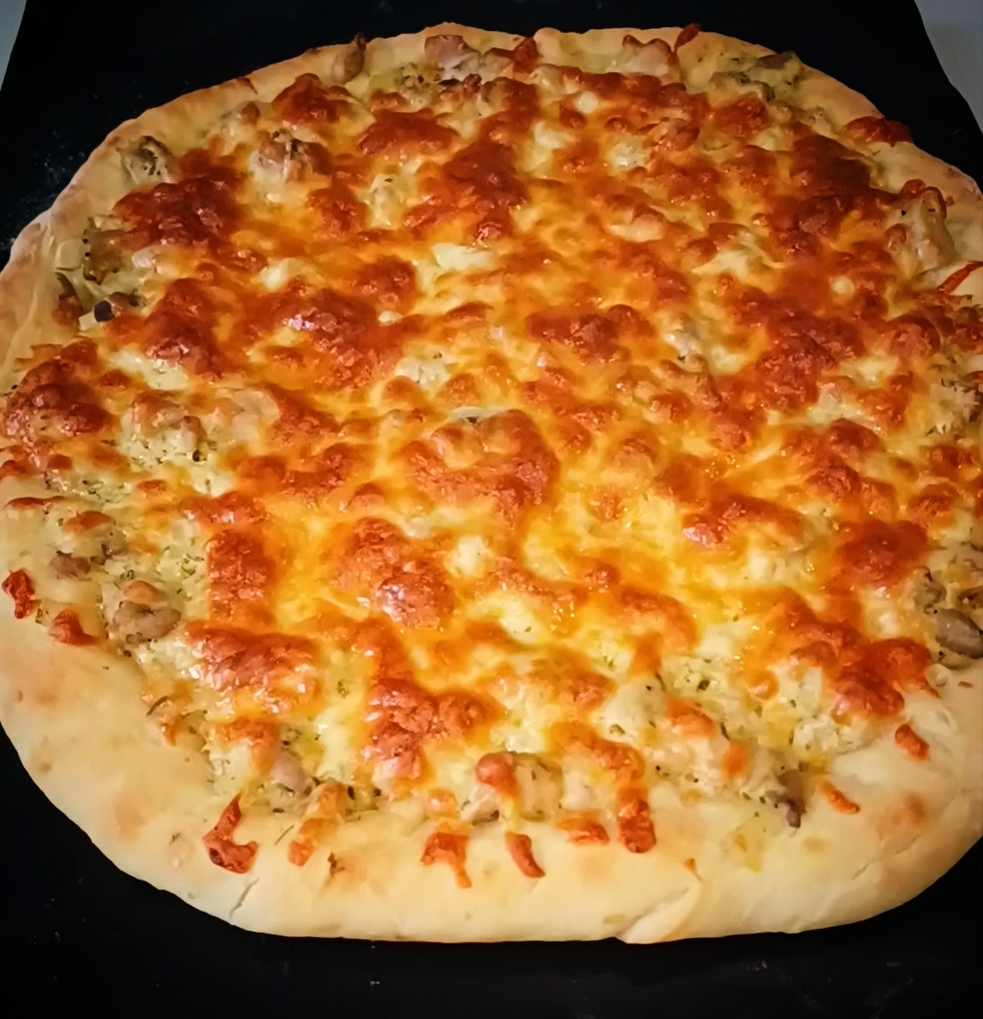 Перейдем к сборке пирога. На присыпанном мукой столе раскатайте тесто в лепешку и перенесите ее на противень. Заполняйте начинкой и щедро посыпьте тертой моцареллой — это поможет создать аппетитную корочку.