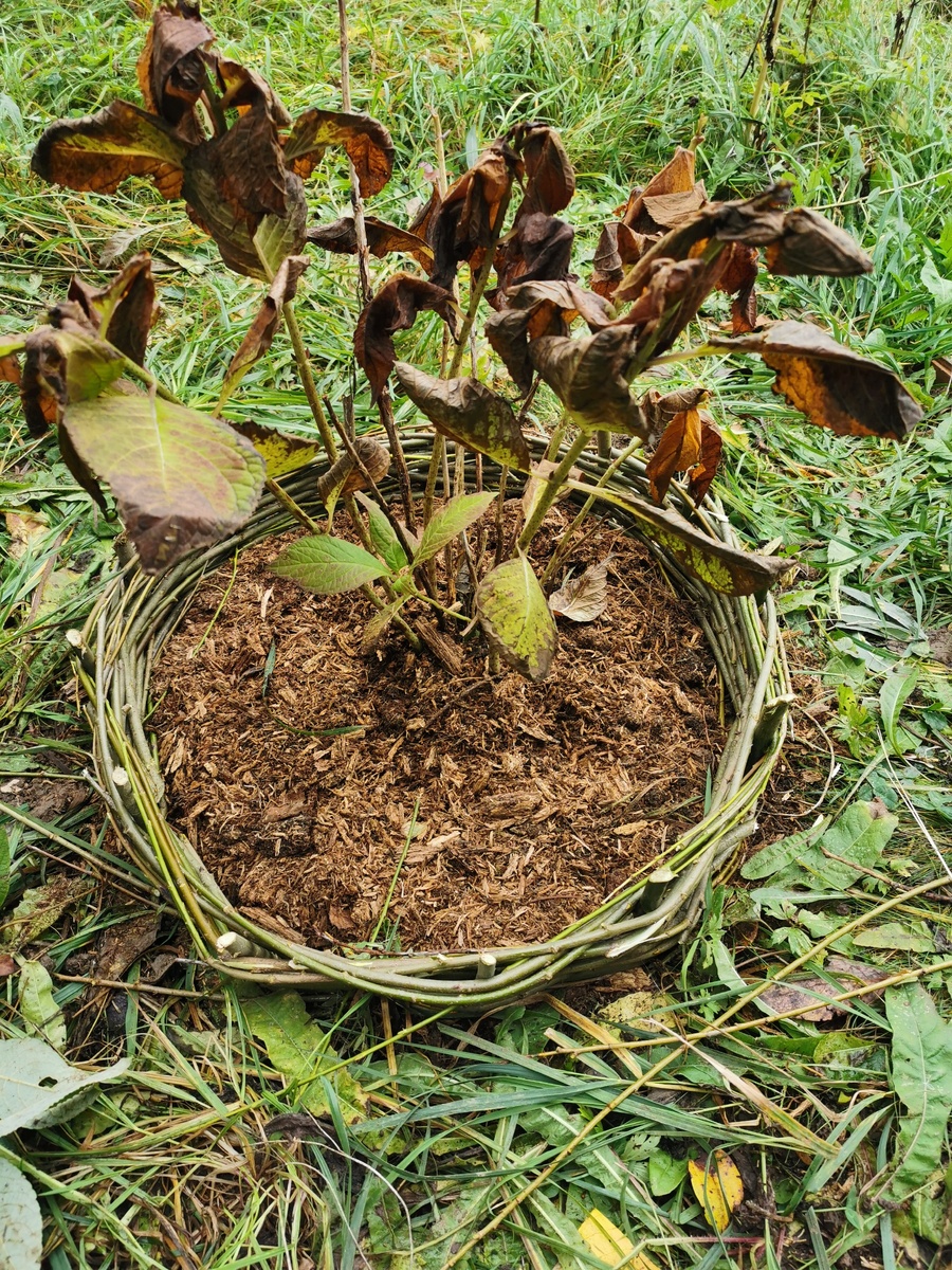 После сбора материалов колышки устанавливаются по кругу вокруг центра, где будет располагаться пересаженная гортензия. Затем, используя лозу, необходимо начать оплетение колышков, как в классическом плетении корзины.