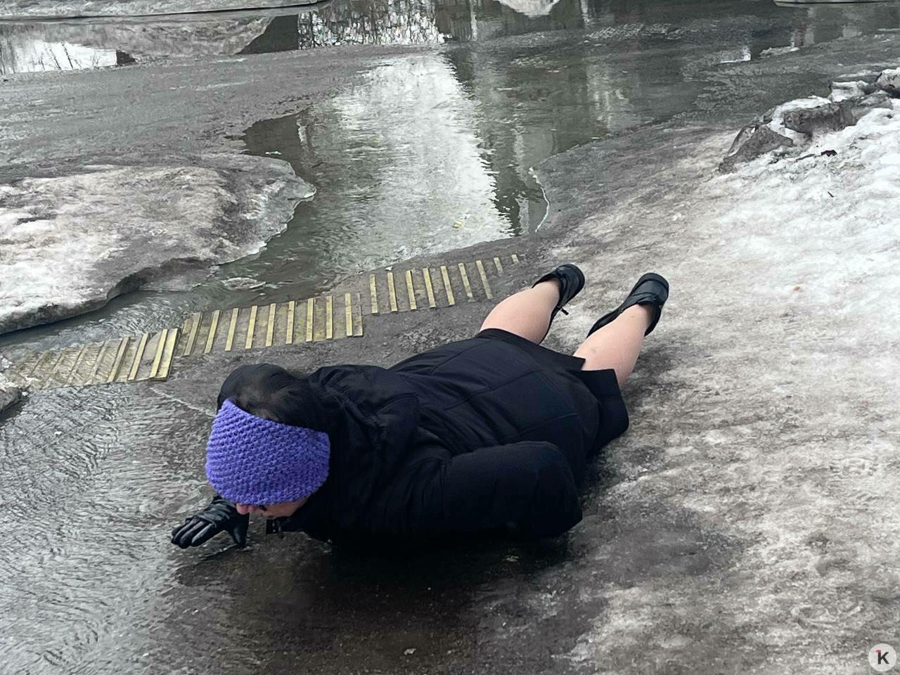 Люди пытаются обойти опасный участок, однако сделать это сложно: часть дорожки всё ещё покрыта ледяной коркой. Пешеходы поскальзываются и падают. Одна из женщин разбила лицо.
