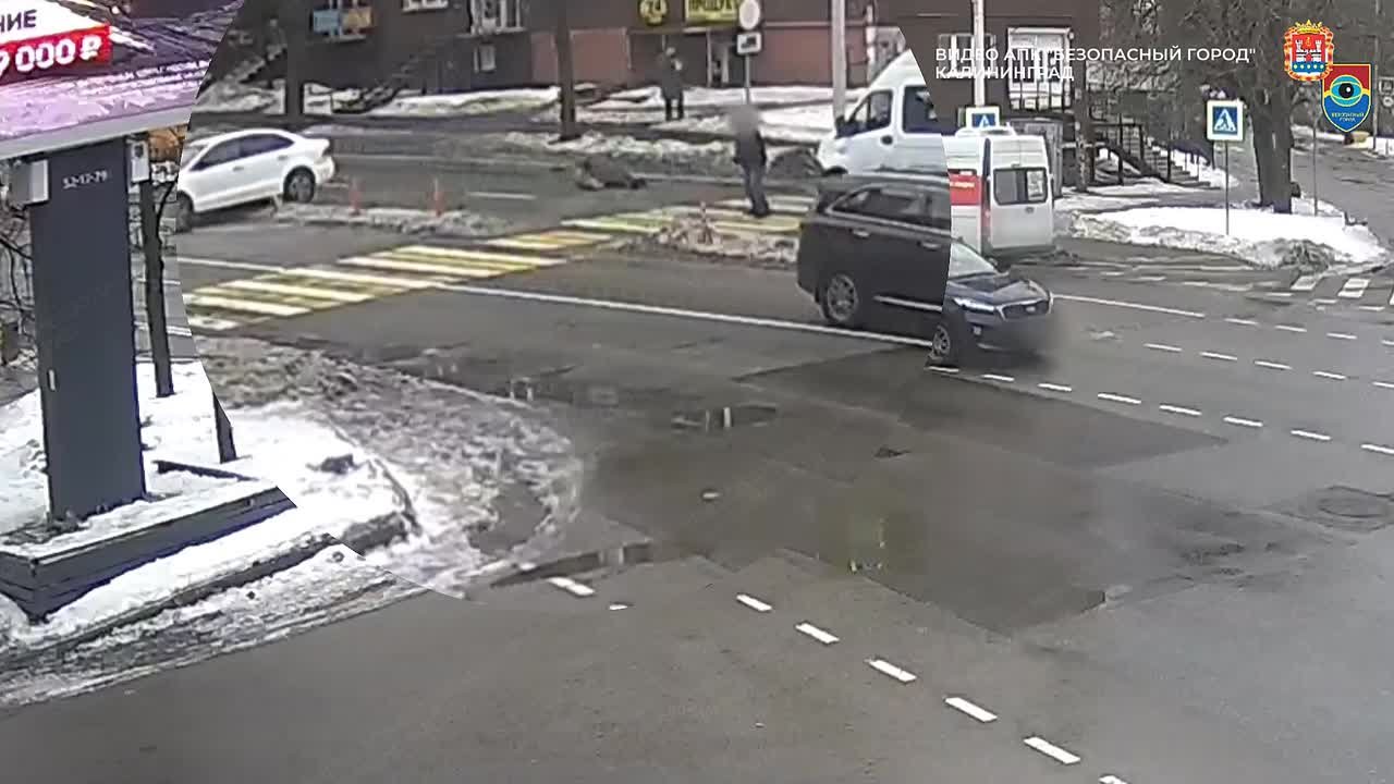 «Безопасный город» опубликовал кадры ДТП на улице Киевской в Калининграде: водитель проскакивает через пешеходный переход и сбивает человека.