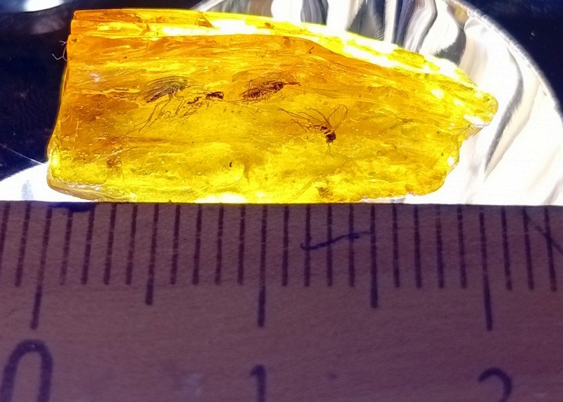Женщина гуляла у памятника императрице Елизавете Петровне, когда в тёмной полосе выброшенного морем мусора сверкнул жёлтый обломок. Горожанка наклонилась, подняла и рассмотрела на просвет: окаменелость меньше половины пальца темнела 5 инклюзами. Пятеро мошек застряли в одной и той же капле смолы десятки миллионов лет назад одновременно!