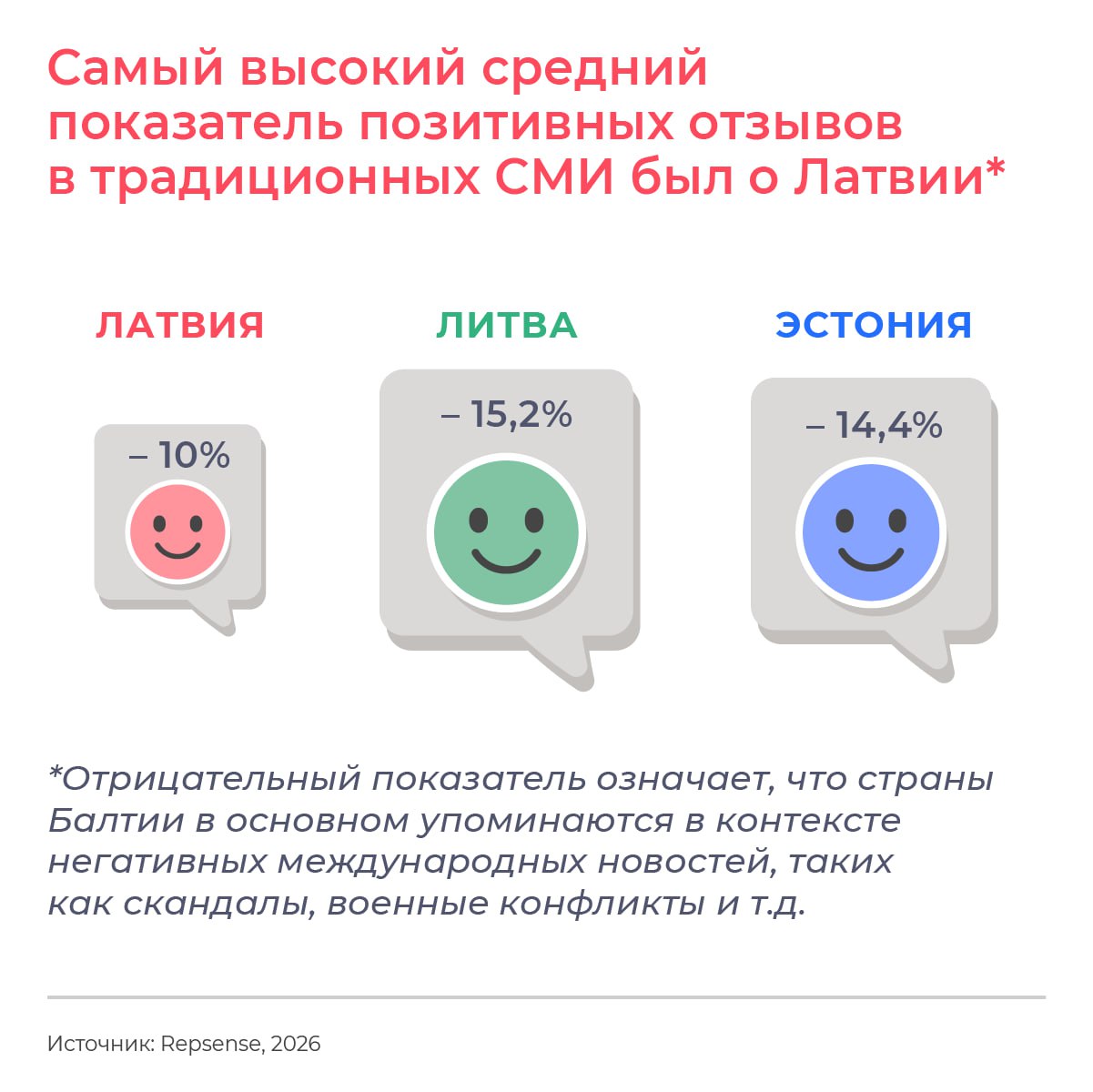 При этом самый высокий средний показатель позитивных отзывов в традиционных СМИ был о Латвии.