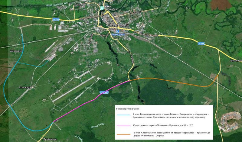 За 3,02 млрд рублей должны построить 6,9 километра новой дороги, которая соединит к востоку от аэродрома дорогу Черняховск – Крылово с дорогу Черняховск – Озёрск с выходом к федеральной трассе А-229.
