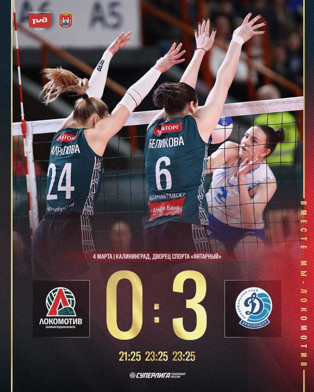 4 марта в матче женской волейбольной Суперлиги калининградский «Локомотив» встретился с «Динамо» из Краснодара. Игра завершилась победой гостей со счётом 0:3.