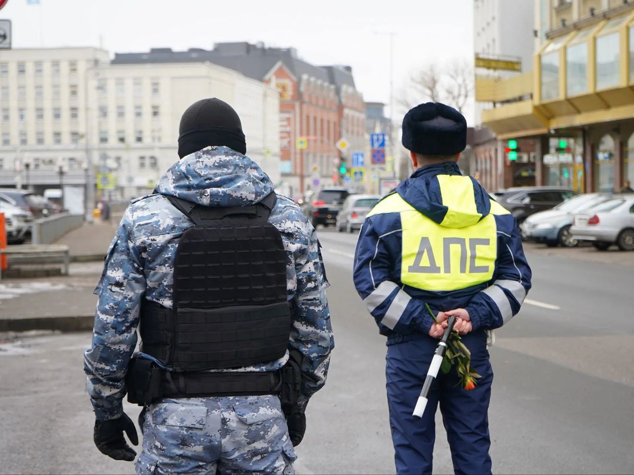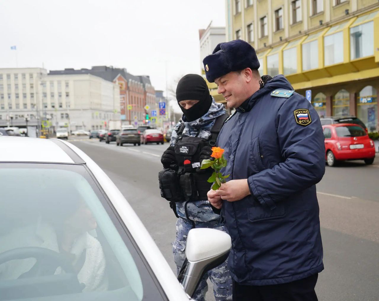 Женщины-водители явно не ожидали ничего приятного от мужчин с суровыми лицами в сопровождении спецназовца. Оказалось, они просто хотели подарить розочку и поздравить с наступающим женским днём. Заодно просветили, где можно узнать о долгах.