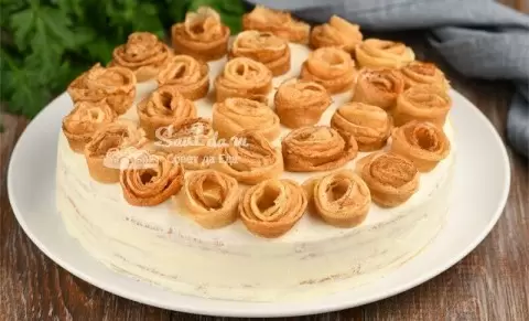 Для крема взбить размякшее масло с сахаром и ванилью, затем добавить сгущенное молоко и творог. Получившуюся массу использовать для прослойки между блинчиками. Можно украсить торт лентами из блинчиков, свернув их в цветы.