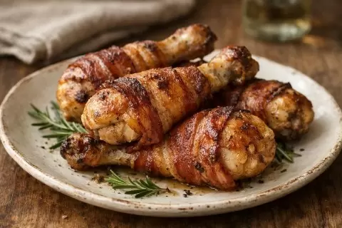 Эти куриные ножки готовятся так, что мясо остается нежным и сочным, а корочка – хрустящей и ароматной. Под кожей ножек прячется сочетание сливочного масла, чеснока и свежих трав, а бекон создает защитную оболочку, предотвращая пересушивание мяса. Легкость в приготовлении делает это блюдо идеальным как для обычного ужина, так и для праздничного стола.