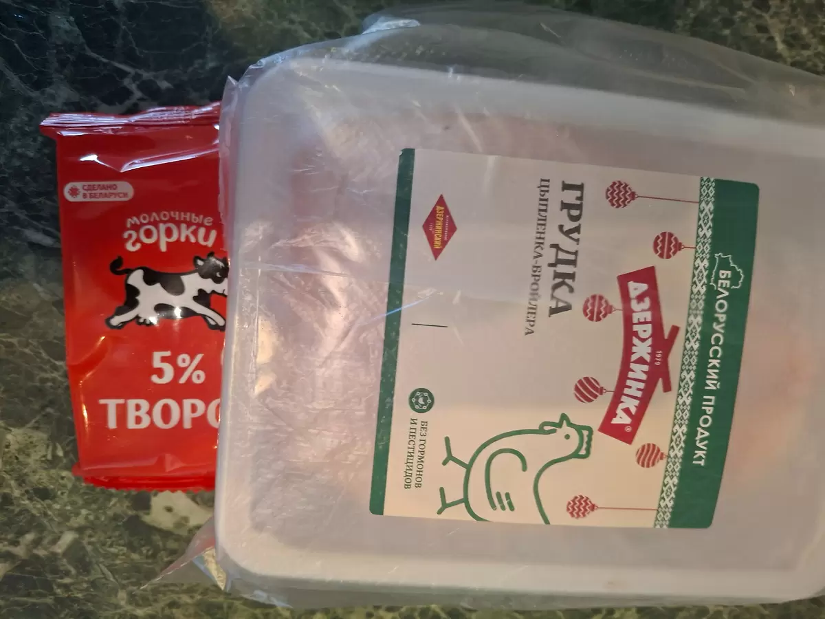 Первым делом муж перекрутил целую упаковку куриной грудки с пачкой 5%-ного творога, луком и яйцом. Из получившегося фарша были слеплены котлеты, содержащие 22 грамма белка и всего 121 калорию на 100 грамм.