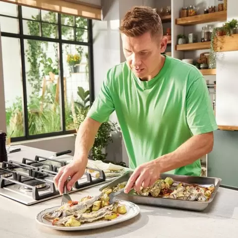 Когда блюдо будет готово, порционные тарелки нуждаются в оформлении: на них раскладываются по две рыбы и овощи, дополненные любой любимой зеленью. Путассу не только обладает нежным вкусом и низким содержанием жира, но и дает много возможностей для гастрономических экспериментов. Шеф Белькович отмечает, что это отличный вариант как для быстрого ужина, так и для праздничного стола.