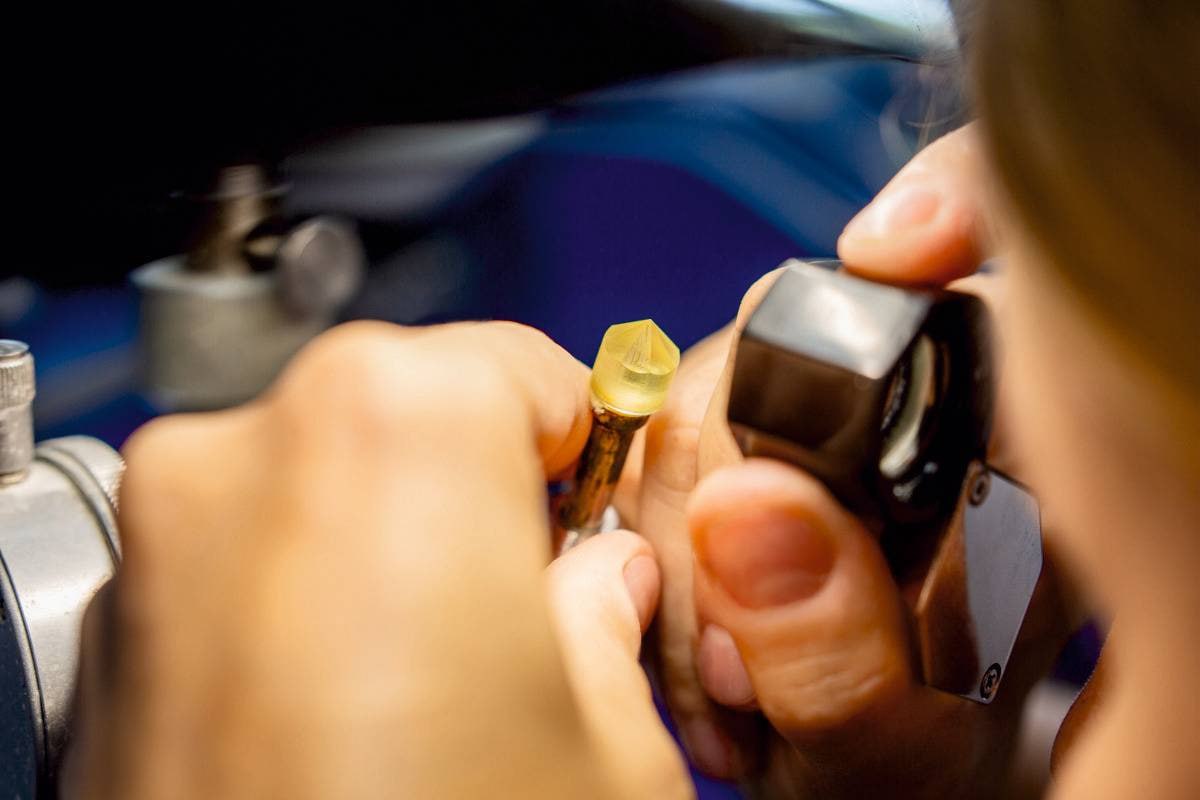 «Камушки» начали делать еще 5 лет назад. Мягкий от природы янтарь укрепляют в автоклавах: под воздействием давления и температуры из него уходят микропузырьки воздуха и влага. Каждая грань (их количество варьируется от 17 до 88) формируется вручную под точно рассчитанным углом. Грани наносят на станке с алмазным диском. За смену мастер обрабатывает до 15 камней.