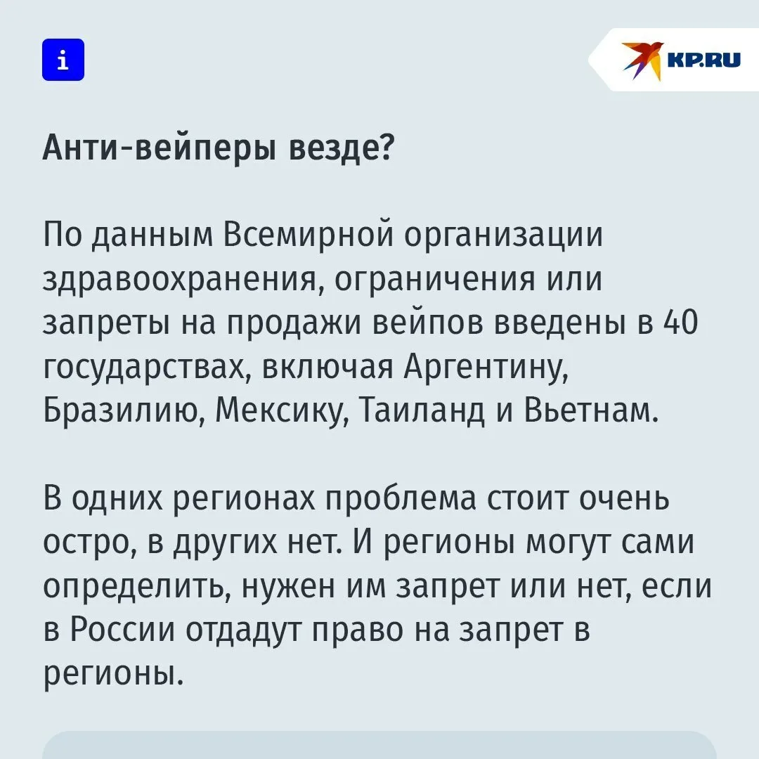 Союз потребителей поддержал инициативу Госдумы о полном федеральном запрете на продажу вейпов в России. Эта тема обсуждается с прошлого года: уже введены ограничения на продажу вейпов и жидкостей для них несовершеннолетним, а штрафы за нарушение возросли до 2 миллионов рублей. Решение о полном запрете предлагается принять регионам, а Госдума планирует узаконить его в мае, пишет «Комсомолка».