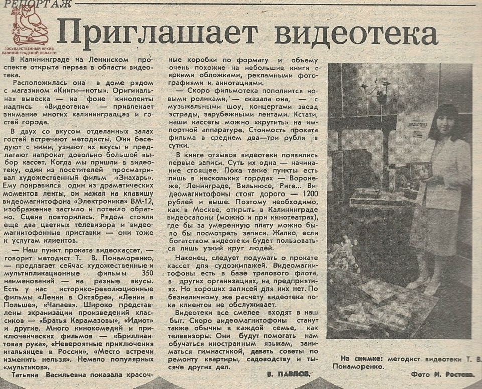 В ноябре 1985 года газета «Маяк» сообщила: в Калининграде появилась первая в области видеотека. По тем временам это звучало почти фантастически — видеомагнитофоны стоили от 1200 рублей, и позволить себе их могли единицы, чаще всего...
