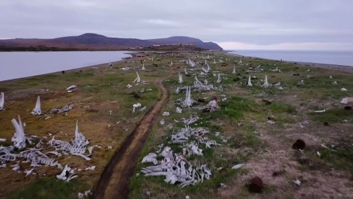 Китовое кладбище в Янракынноте — одно из самых крупных на Чукотке. В 90-х годах был временно разрешен промышленный китобойный промысел для избежания голода у местного населения. На берегу годами собирали останки китов, доставляемых китобойным судном...